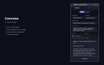 Conceso – AI Email Writer, Chrome tarayıcısı için tasarlanmış bir e-posta yazma aracıdır. Kullanıcıların profesyonel e-postaları hızlı ve kolay bir şekilde oluşturmalarına olanak tanır. İki farklı modda çalışır: Form Modu ve Sohbet Modu. Form Modu, kullanıcının rol, alıcı, ton ve temel bilgileri doldurmasına olanak tanırken, Sohbet Modu, kullanıcının ihtiyaçlarını tanımlamasına yardımcı olur ve akıllı takip soruları sorarak mükemmel bir e-posta oluşturur.